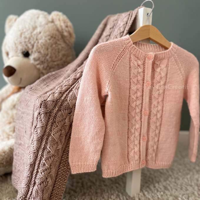 The blanket can also be accompanied by the Juliette cardigan. (Pattern sold separately.)