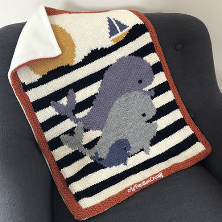 Tricotez vous-même cette jolie couverture pour l'arrivée d'un bébé avec la laine et les couleurs de votre choix. Amusez-vous à la personnaliser en tricotant autant de baleineaux que vous le souhaitez et en tricotant les baleines, les rayures et le fond dans des couleurs différentes.